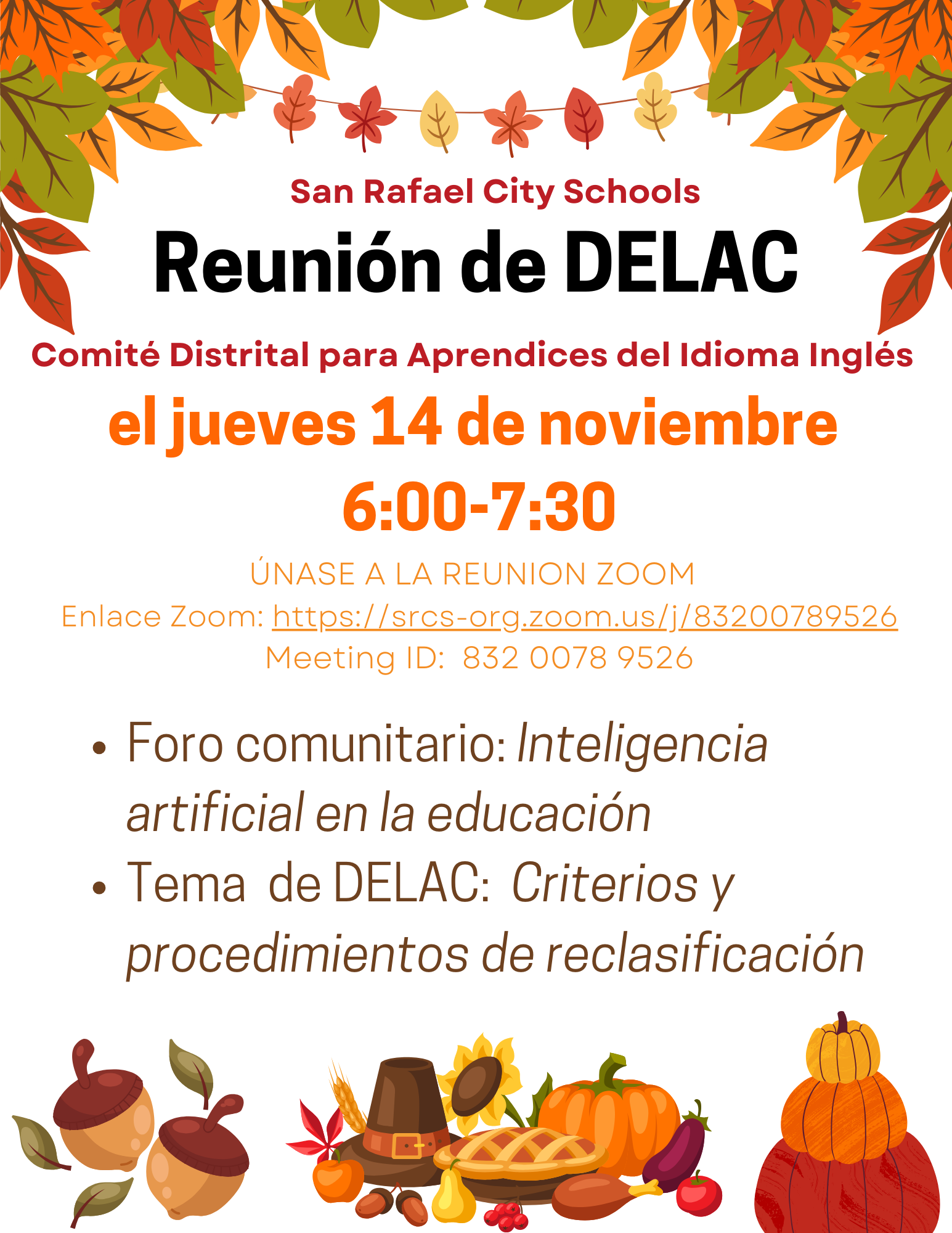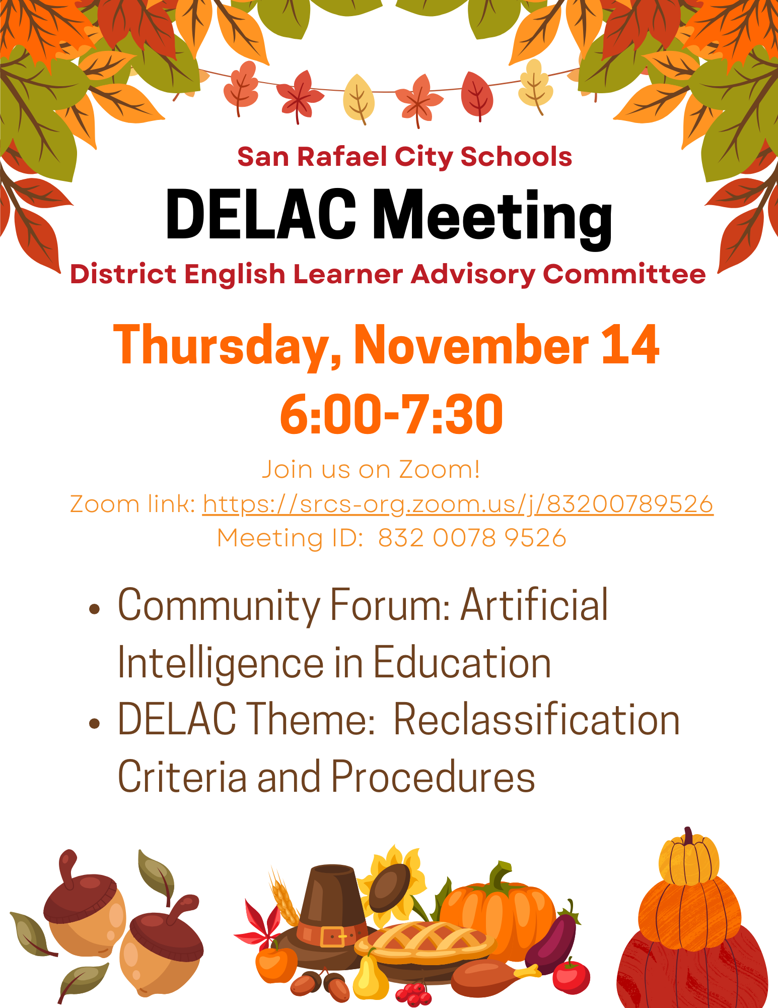 We are pleased to invite you to the District English Learner Advisory Committee (DELAC) meeting this Thursday, November 14 at 6:00 PM. The meeting will be held virtually, and you can join us using the Zoom link provided below.